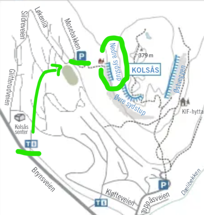 Line 3 T-bane to Kolsås, then walk 20 minutes north to Nedre Sydstup Parkering. From there follow the path into the forest and to the wall past a small cabin.